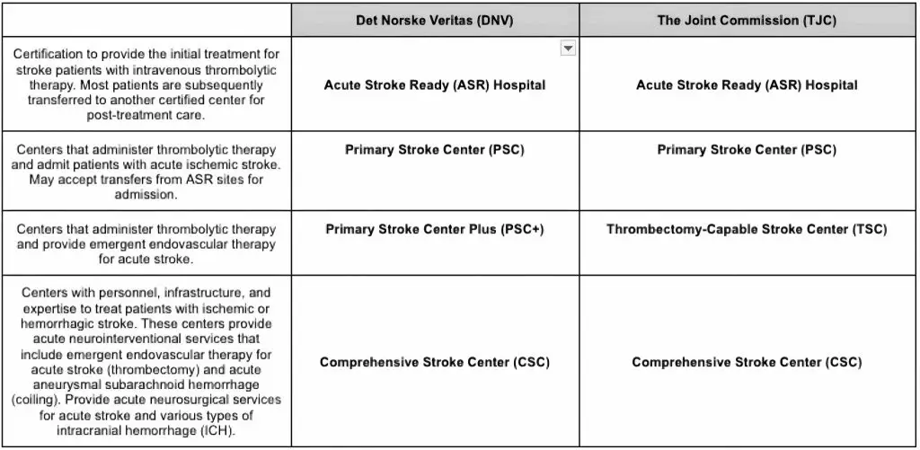 Two of the major national certifying organizations and their respective classifications for stroke levels of stroke center certification are compared below.