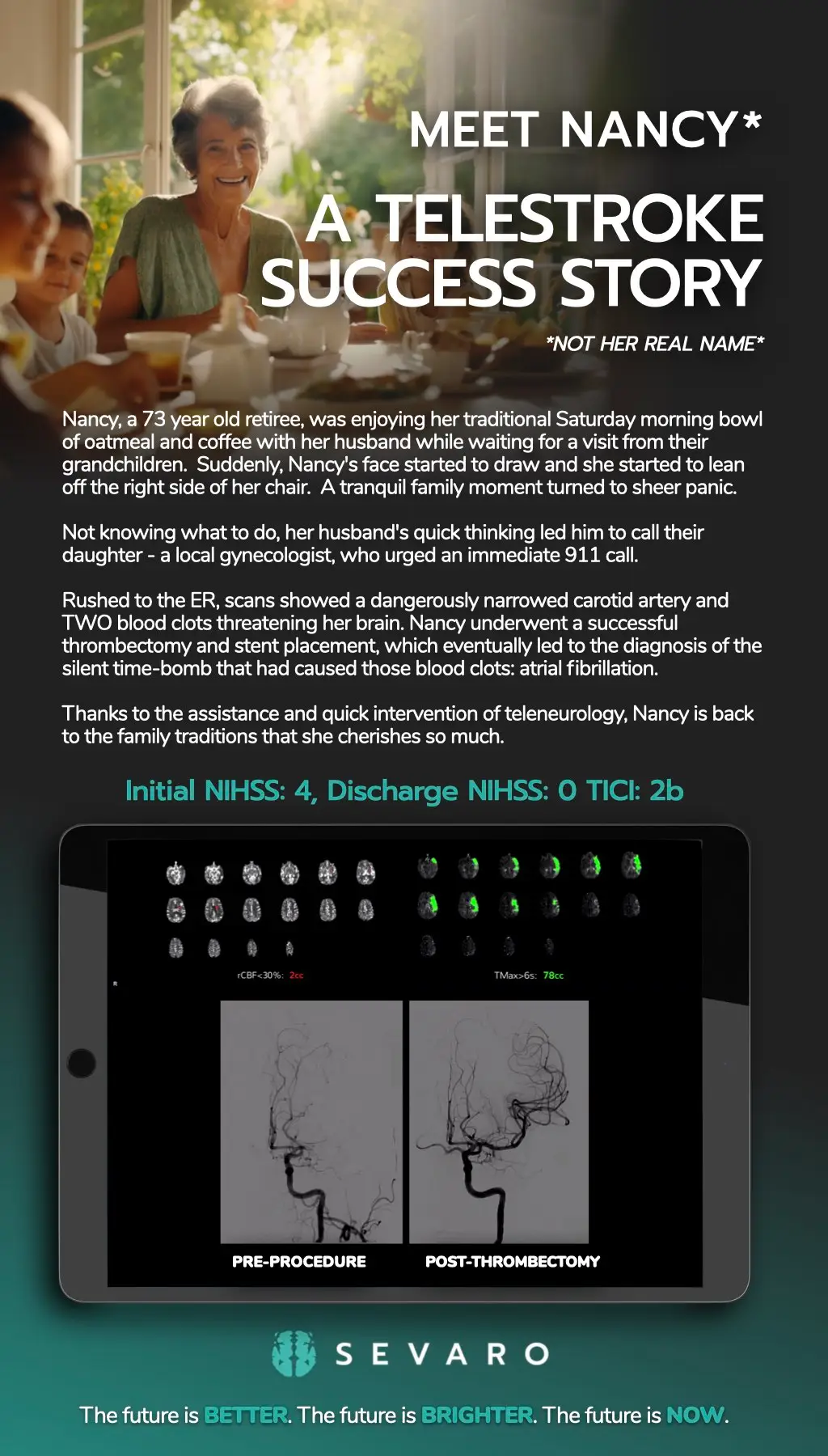 Nancy, a 73 year old retiree, was enjoying her traditional Saturday morning bowl of oatmeal and coffee with her husband while waiting for a visit from their grandchildren. Suddenly, Nancy’s face started to draw and she started to lean off the right side of her chair. A tranquil family moment turned to sheer panic.
