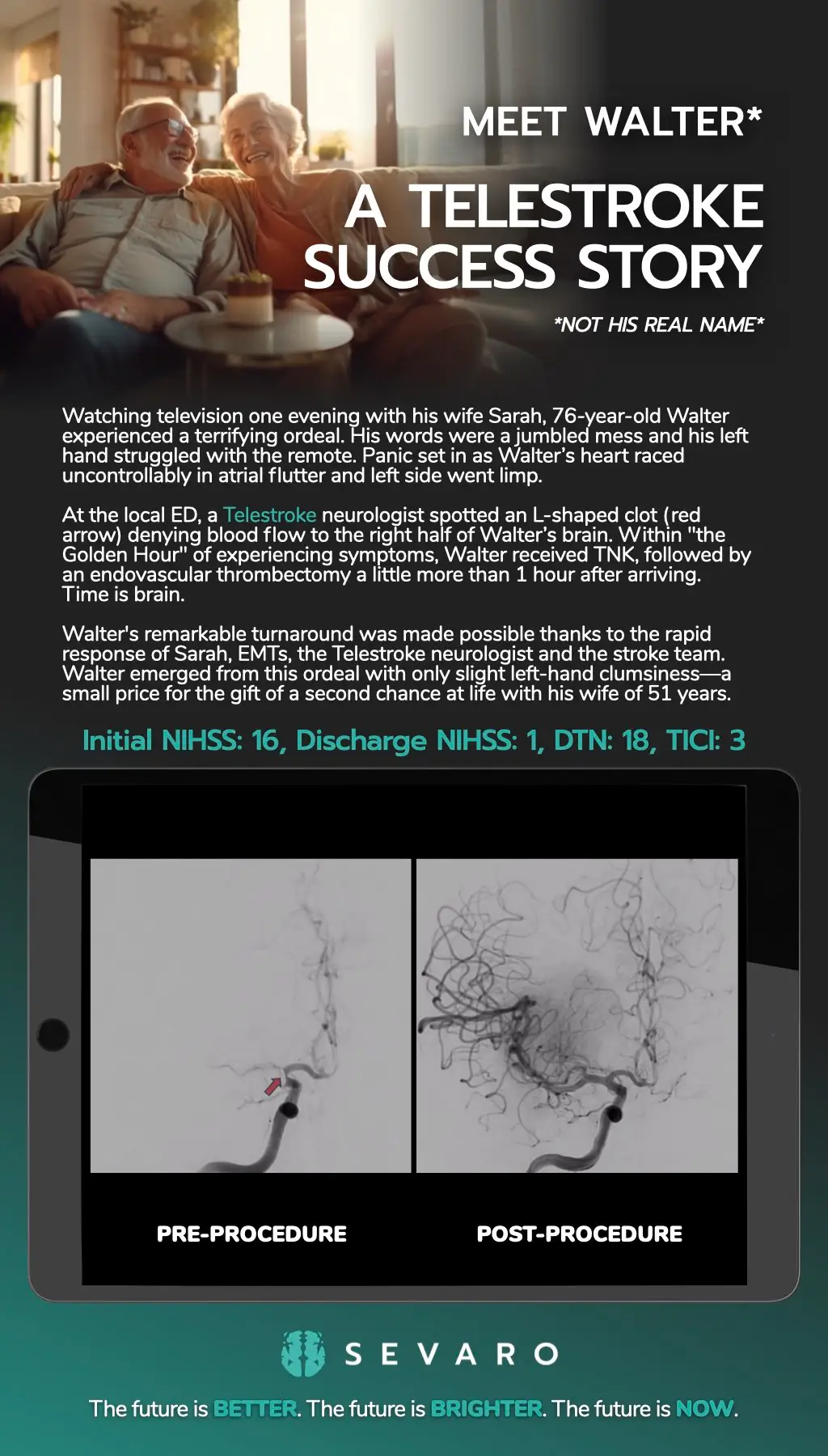 At the local ED, a Telestroke neurologist spotted an L-shaped clot (red arrow) denying blood flow to the right half of Walter’s brain. Within “the Golden Hour” of experiencing symptoms, Walter received TNK, followed by an endovascular thrombectomy a little more than 1 hour after arriving. Time is brain.